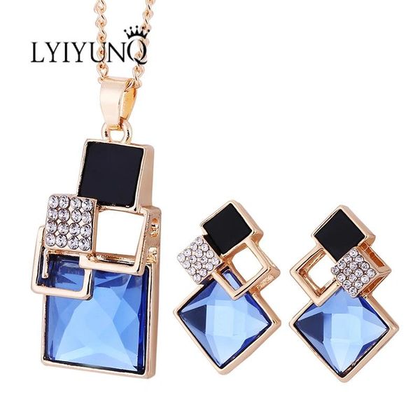 Gold colored Link Chain 17.75" (45+5cm), 1"Acrylic black, Zinc Alloy, Rhinestone, Beautiful Blue Crystal. Earrings 1", Pierced Straight back post.